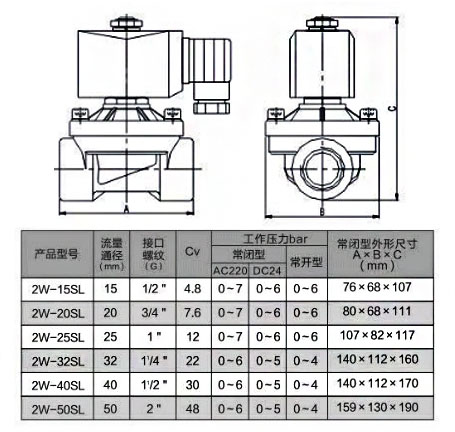 AC220V~240V、AC110V50/60Hz、DC24/12V。IP65、H級(jí)。 DIN43650A接線盒配置的塑封線圈。 DN15~20mm: AC220V 20VA、 DC24V 20W DN25mm: AC220V 20VA、 DC24V 32W DN32~50mm: AC220V 30VA, DC24V 38W。 |
