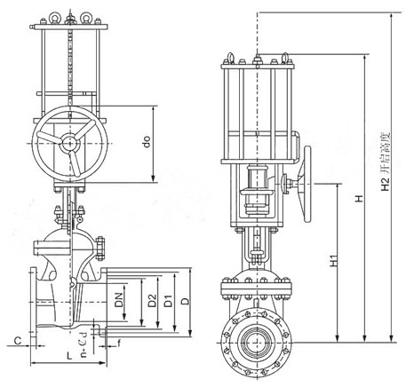 1、本閥主要由閥體、閥蓋、閘板、閥桿、密封圈、雙層氣缸及其活塞、活塞桿、隔板連同緩沖機(jī)構(gòu)、手動機(jī)構(gòu)、氣動-手動轉(zhuǎn)換裝置和閥蓋填料裝置等部分組成。