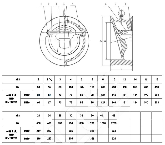 不銹鋼單板對(duì)夾式止回閥主要外形結(jié)構(gòu)尺寸