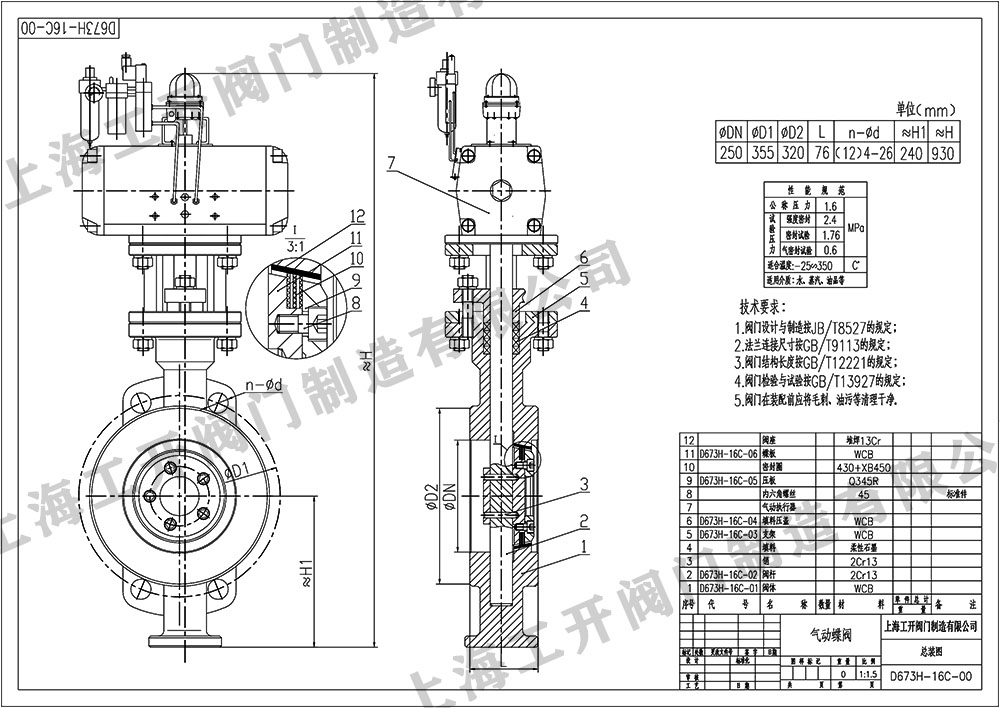 氣動(dòng)蝶閥D673H-16C-DN250蝶閥圖紙尺寸