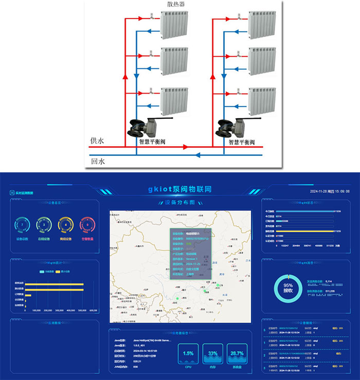 典型應(yīng)用案例:單元入口處回水管道安裝此閥門,即在二次網(wǎng)系統(tǒng)樓前安裝物聯(lián)網(wǎng)水力平衡閥,此平衡閥具有回水溫度采集功能,平衡閥采用RS485通信或內(nèi)置 NB 通訊模塊。通過RS485通信或運(yùn)營(yíng)商N(yùn)B通訊基站將平衡閥所采集的數(shù)據(jù)實(shí)時(shí)傳輸給云服務(wù)器;用戶可通過PC或手機(jī)終端對(duì)云端服務(wù)器進(jìn)行讀取和設(shè)定操作,云端服務(wù)器內(nèi)置全網(wǎng)平衡的軟件策略,云端服務(wù)器會(huì)根據(jù)上傳數(shù)據(jù)自動(dòng)運(yùn)行平衡策略,實(shí)現(xiàn)全網(wǎng)水力平衡,并對(duì)閥門開度進(jìn)行歷史曲線數(shù)據(jù)存儲(chǔ),最終實(shí)現(xiàn)云端服務(wù)器對(duì)二次網(wǎng)系統(tǒng)的全網(wǎng)監(jiān)控。