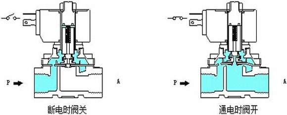 (如圖)通電時,電磁力把先導(dǎo)孔打開,上腔室壓力迅速下降,在關(guān)閉件周圍形成上低下高的壓差,流體壓力推動關(guān)閉件向上移動,閥門打開;斷電時,彈簧力把先導(dǎo)孔關(guān)閉,入口壓力通過旁通孔迅速腔室在關(guān)閥件周圍形成下低上高的壓差,流體壓力推動關(guān)閉件向下移動,關(guān)閉閥門。