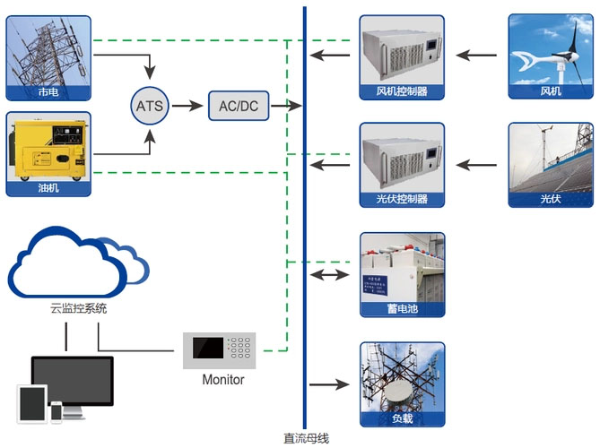 風(fēng)光互補(bǔ)發(fā)電系統(tǒng)是針對(duì)通信基站、微波站、邊防哨所、邊遠(yuǎn)牧區(qū)、無電戶地區(qū)及海島,在遠(yuǎn)離大電網(wǎng),處于無電狀態(tài)、人煙稀少,用電負(fù)荷低且交通不便的情況下,利用本地區(qū)充裕的風(fēng)能、太陽(yáng)能建設(shè)的一種經(jīng)濟(jì)實(shí)用性發(fā)電站。