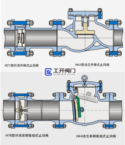止回閥主要作用是防止介質(zhì)倒流,保護管線及泵的安全,屬于自動類閥門。止回閥的種類很多,其中,旋啟式止回閥和升降式止回閥是兩種常見的止回閥類型,升降式止回閥型號主要有法蘭式H41和對夾式H71,旋啟式止回閥型號主要有法蘭式H44和對夾式H76。上海工開閥門下面為大家具體說一說這兩張止回閥的區(qū)別,以便大家更好的選用。